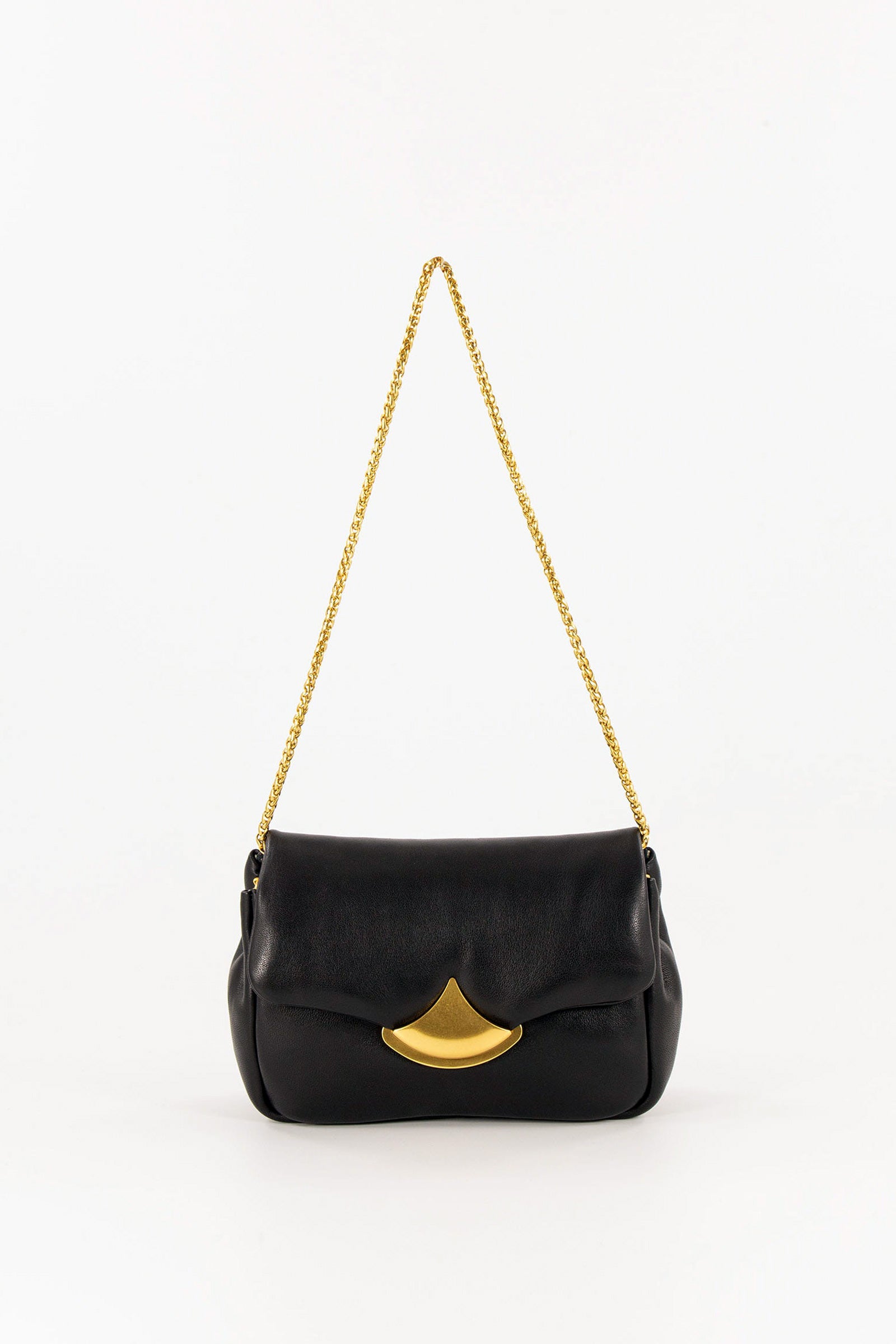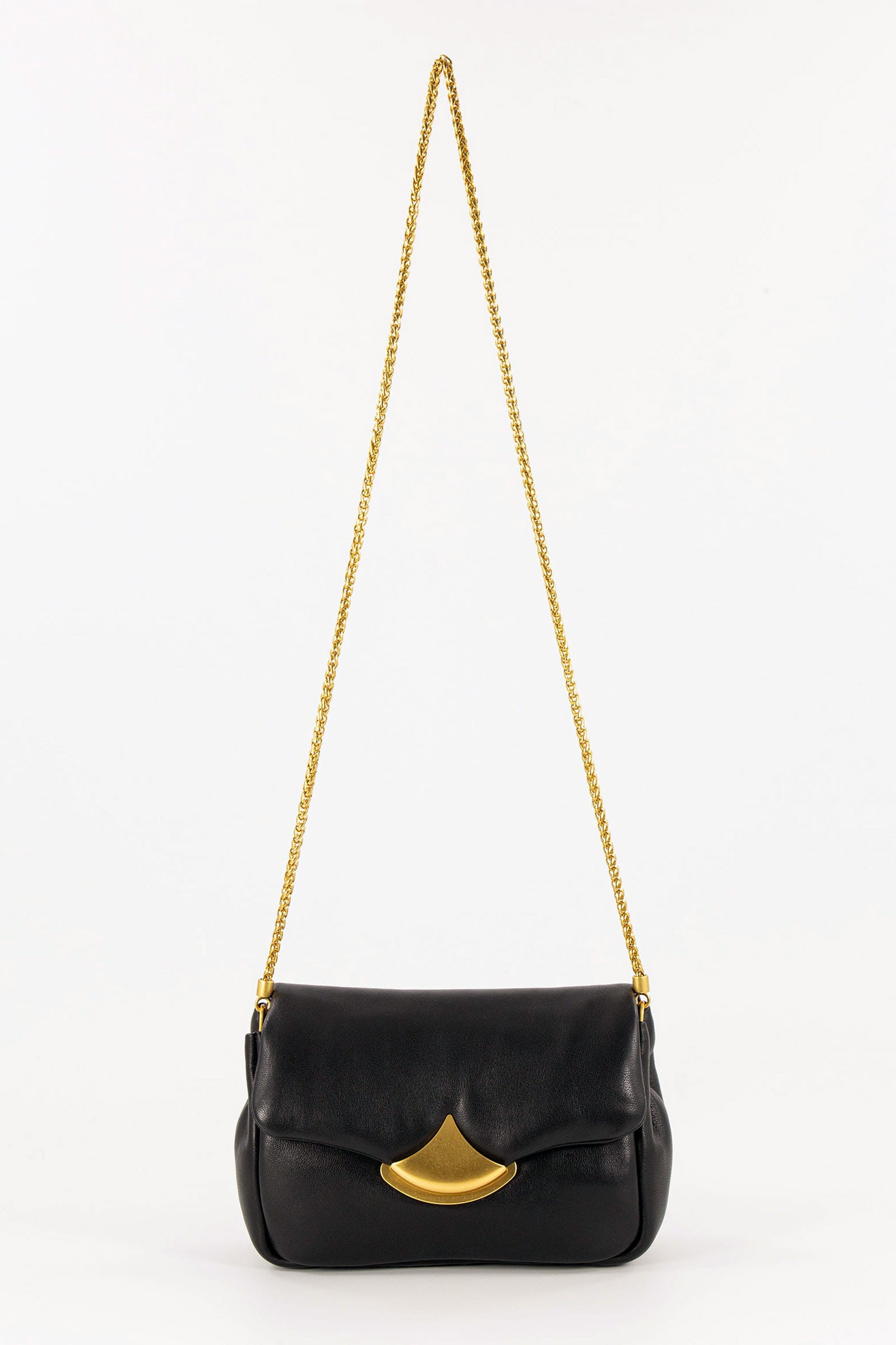 Magnetic clasp closure, gold finished hardware and shoulder strap