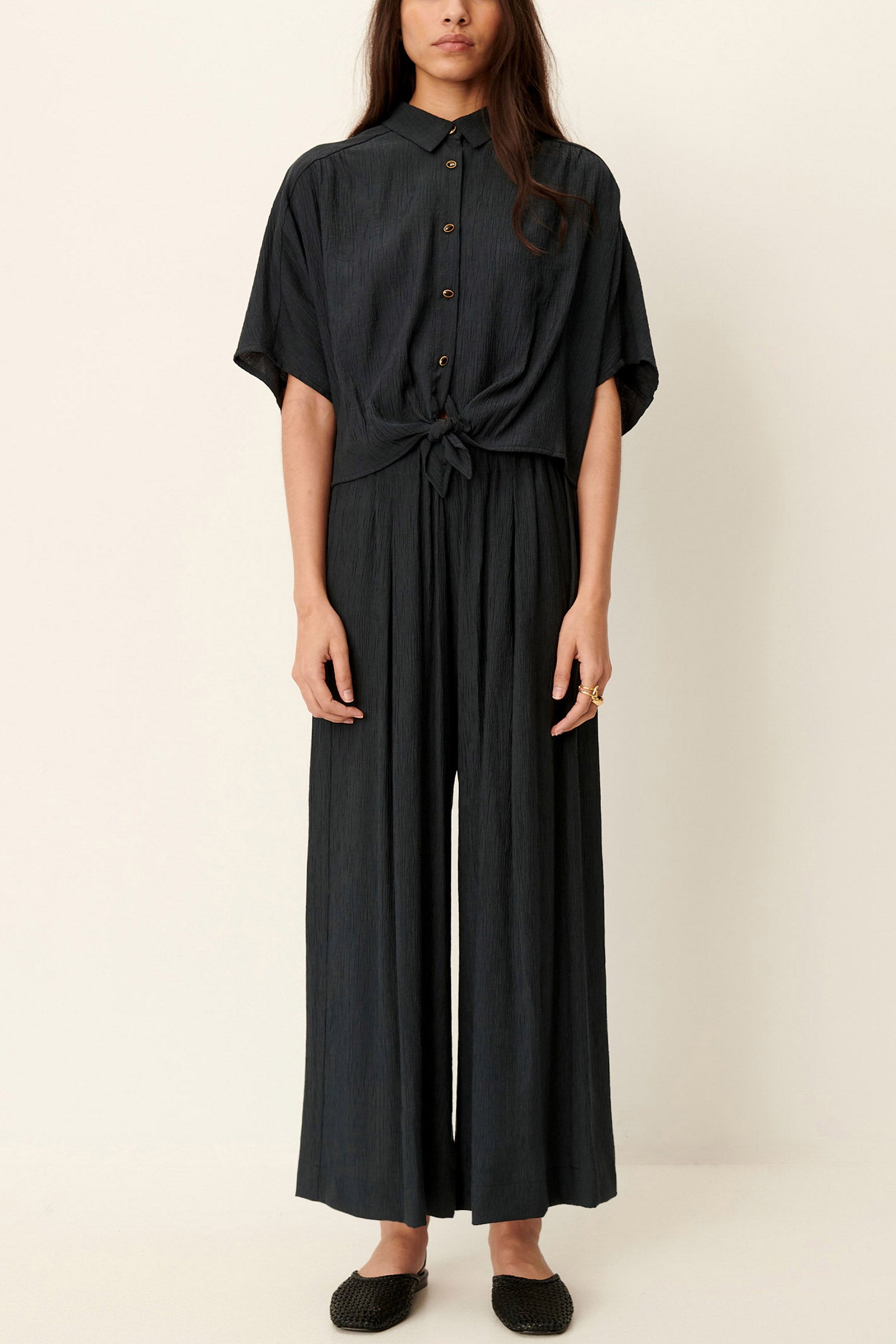 Pressed pleats below the waistband