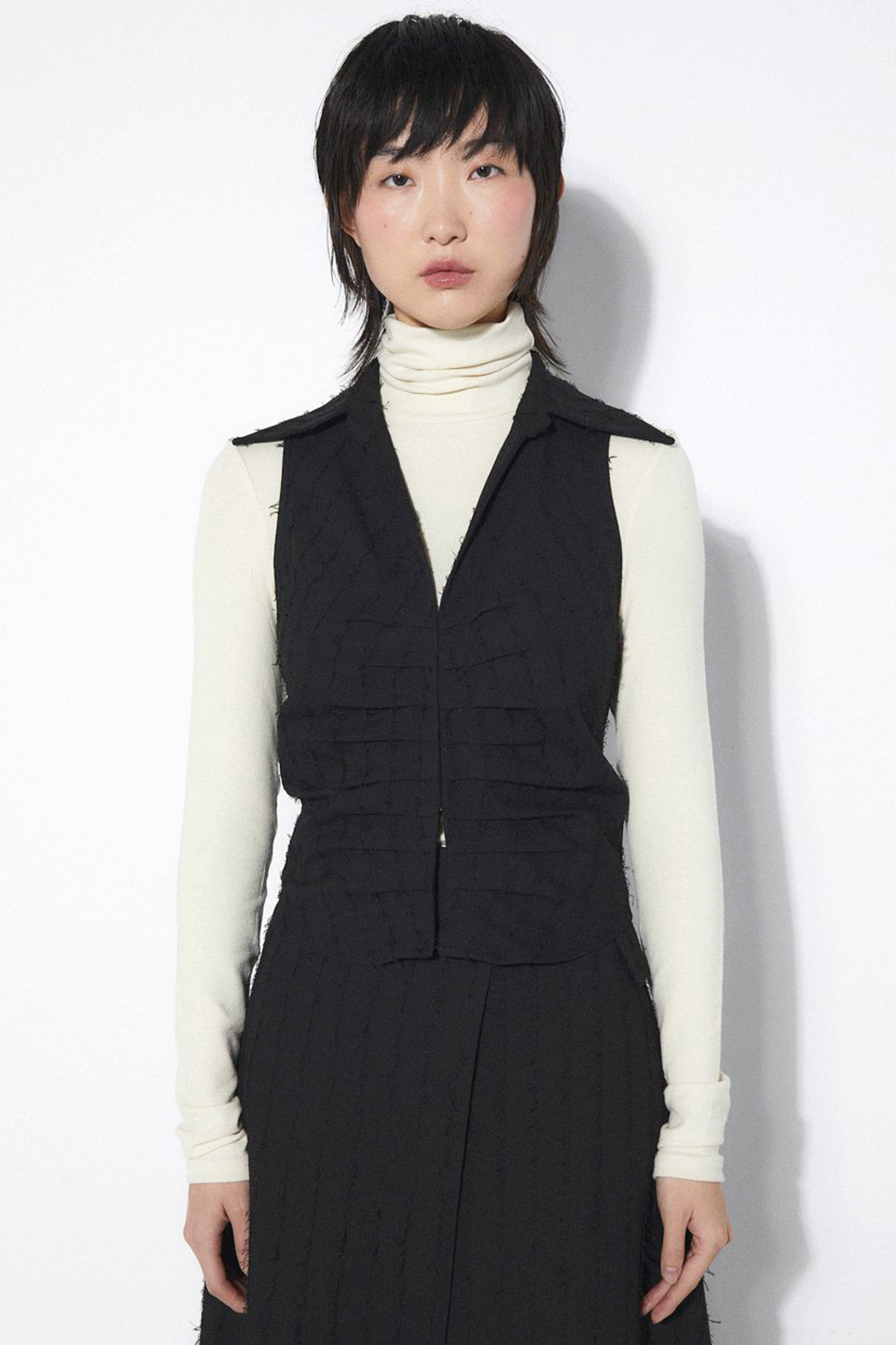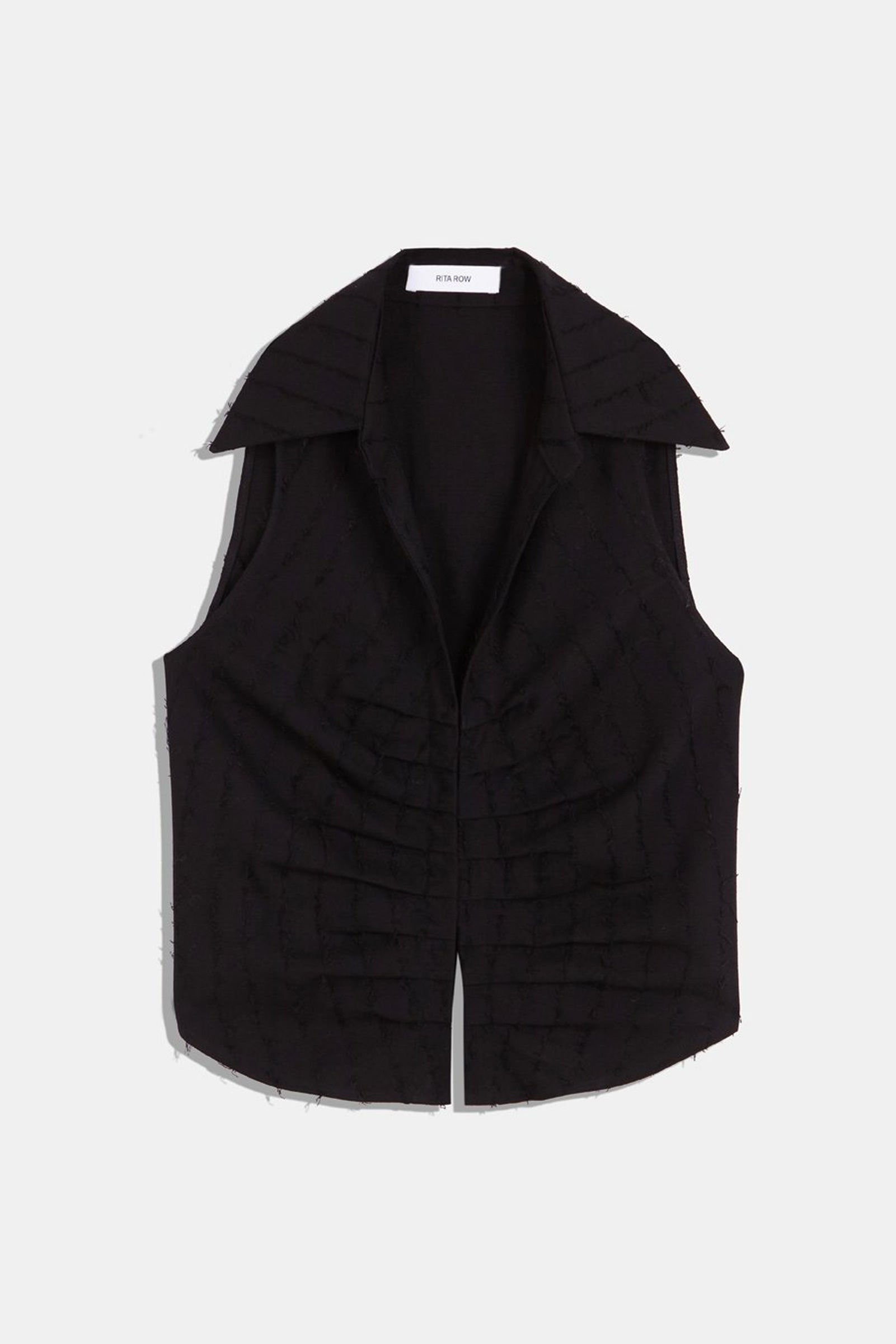 Black viscose-and-polyester blended frayed fabric top