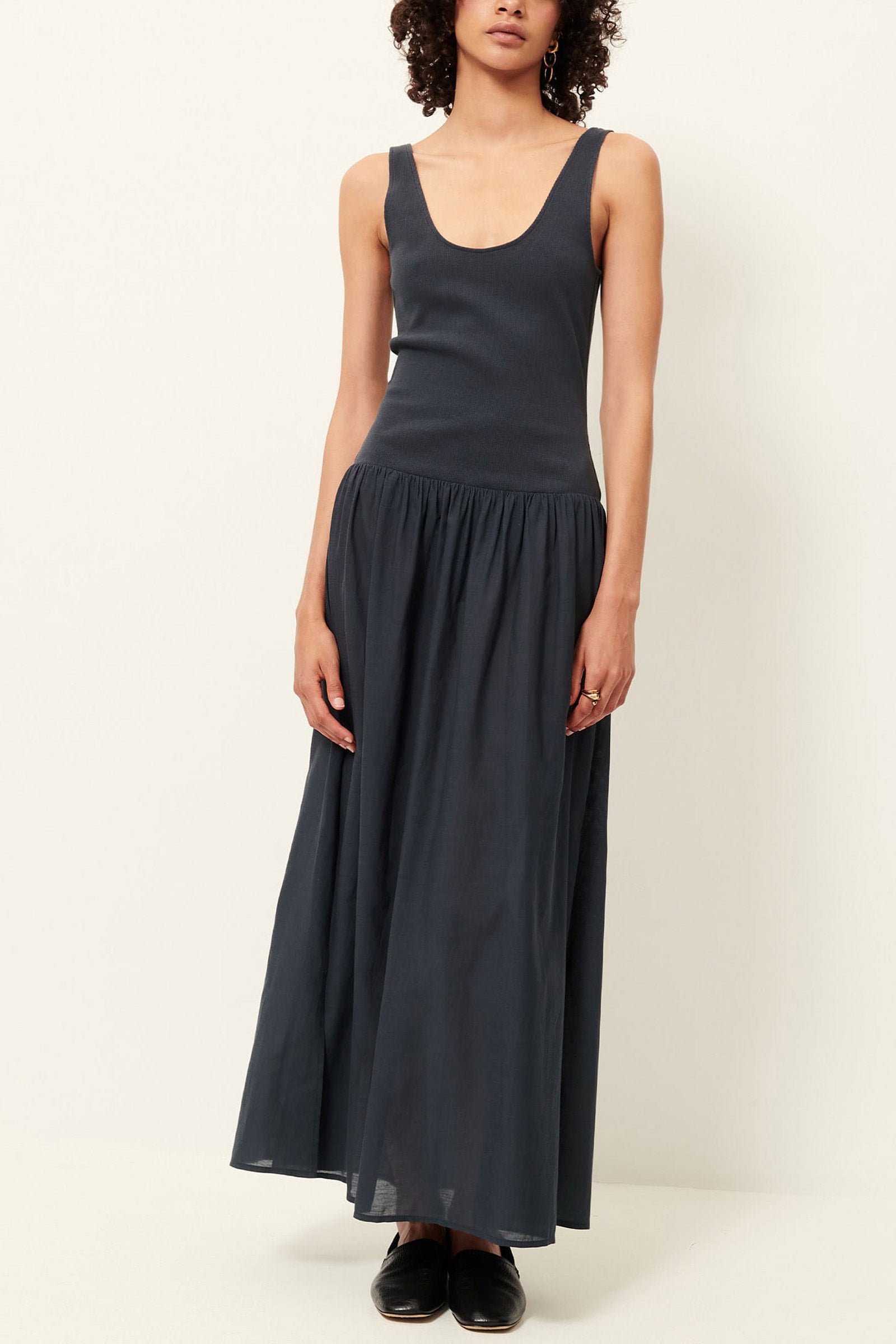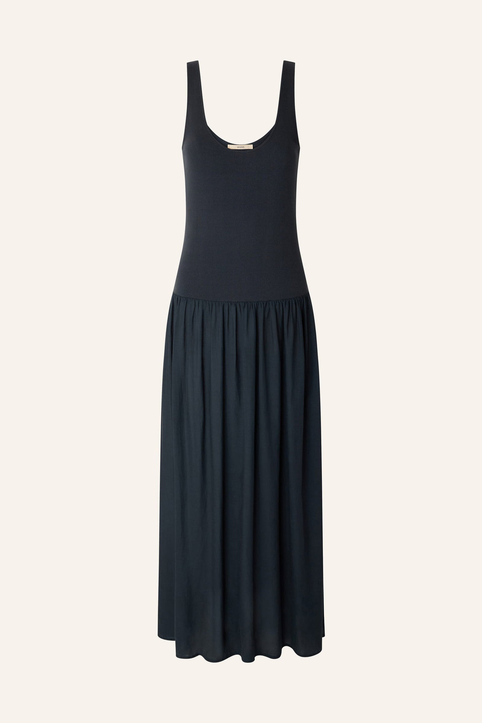 Fine ribbed jersey bodice, and viscose-blended voile skirt